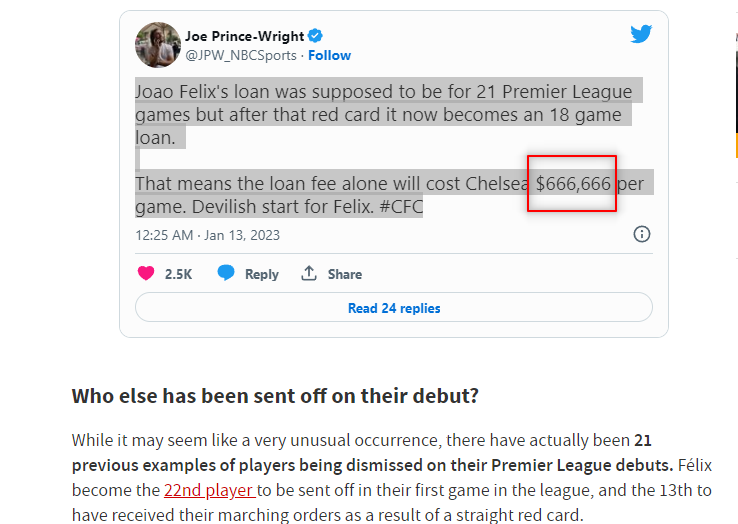 https://twitter.com/JPW_NBCSports?ref_src=twsrc^tfw|twcamp^tweetembed|twterm^1613648428101431296|twgr^0887af0e7d0bfc9eb79512388257ecc74c207402|twcon^s1_&ref_url=https://en.as.com/soccer/joao-felix-sent-off-for-chelsea-how-many-players-have-been-sent-off-on-their-debut-in-the-premier-league-n/