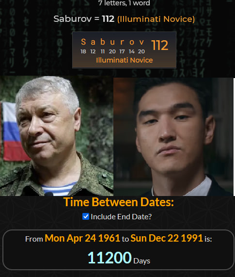 В шифре иллюминатов (описан в книге "История тайных обществ" за авторством Дарал Аркон - A History of Secret Societies" by Arkon Daraul) фамилия Сабурова суммируется в 112.