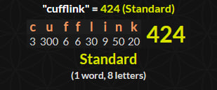 Запонка на англ. в гематрии : "cufflink" = 424 (Standard)