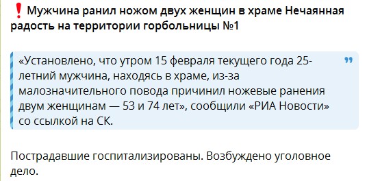 15.02.2026 - Во время утренней службы в храме на территории челябинской ГКБ № 1 на улице Воровского вооруженный ножом человек ранил двоих прихожанок, сообщила пациентка больницы, которая стала свидетелем происшествия.