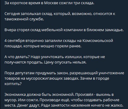 это о перепроизводстве, при том в последний год горели десятки складов и не только с пищевых, и не только в России. Напасть прям какая-то. Девать некуда, а нас убеждают в том, что может наступить голод...