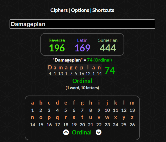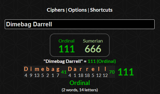 Гитарист по псевдониму Dimebag Darrell (666 в шумерской гематрии) был убит на концерте Damageplan (444 в шумерской гематрии) 8 декабря 2004 года в Коламбусе (штат Огайо) Натаном Гейлом.