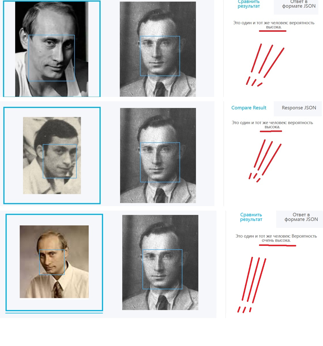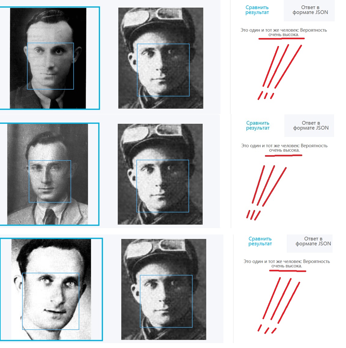 И по всем 3м фото совпадение не просто высокое - а очень высокое . Что говорит о том , что 99,99% это один и тот же человек ..