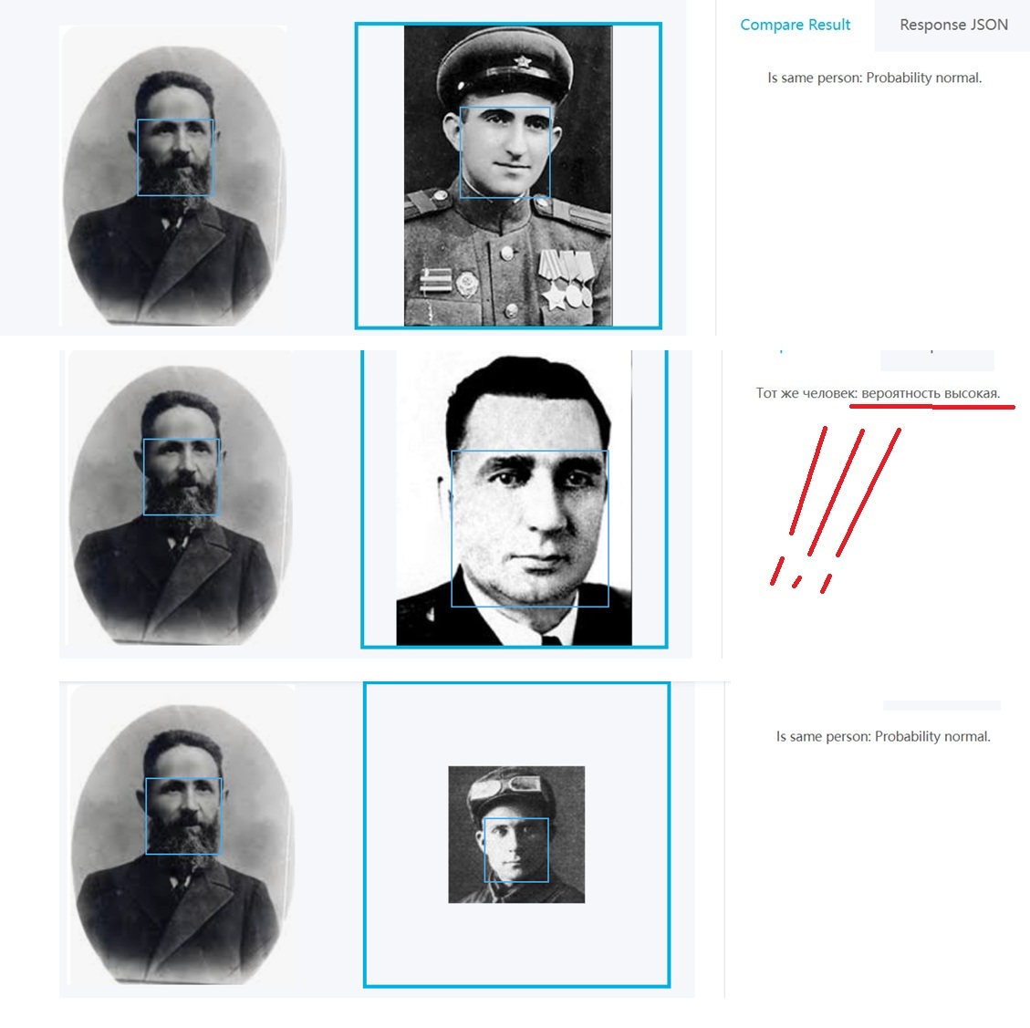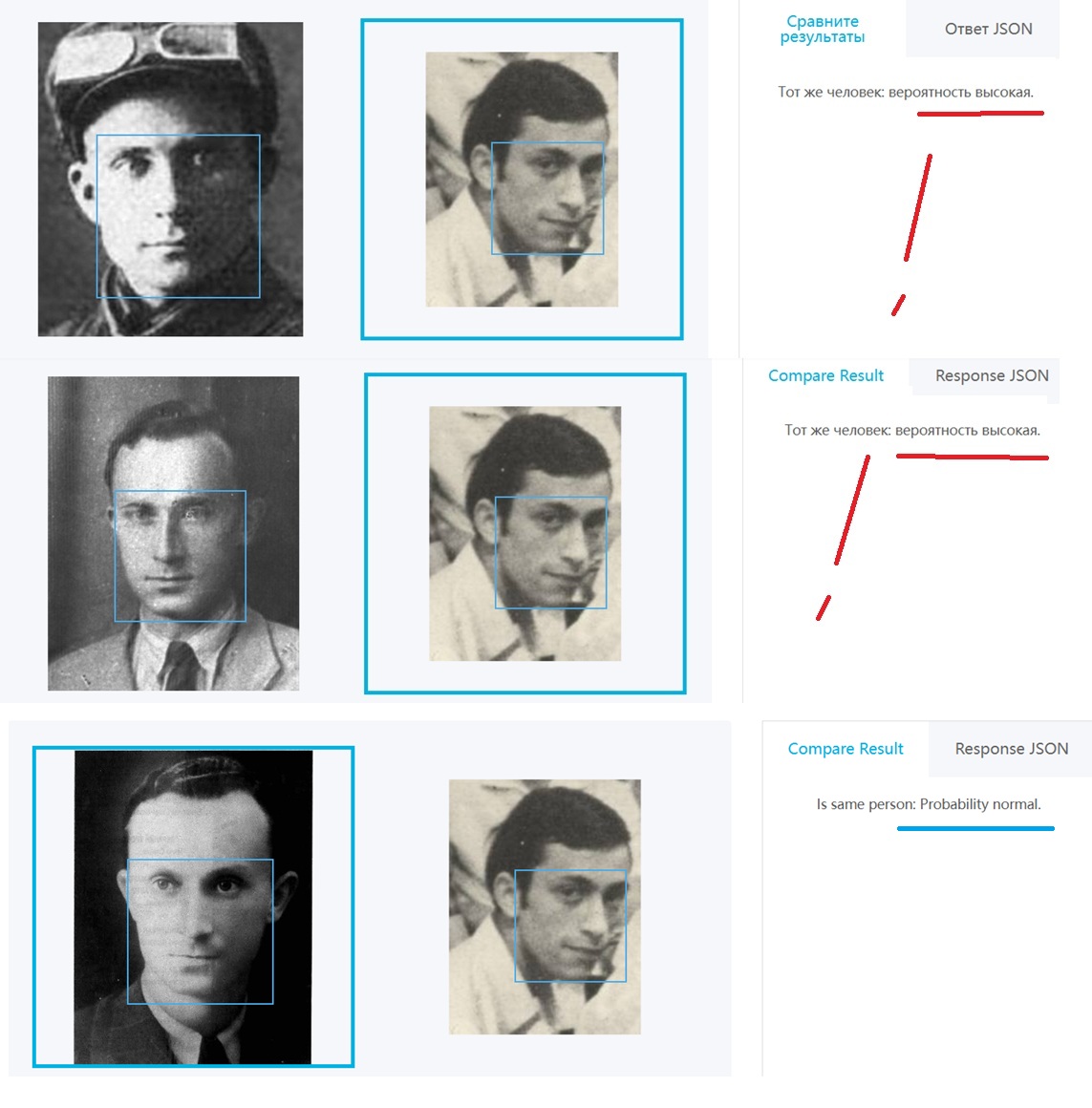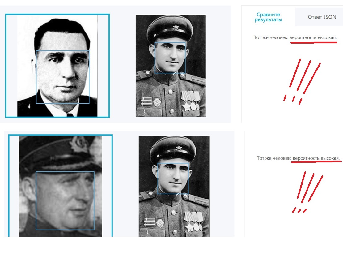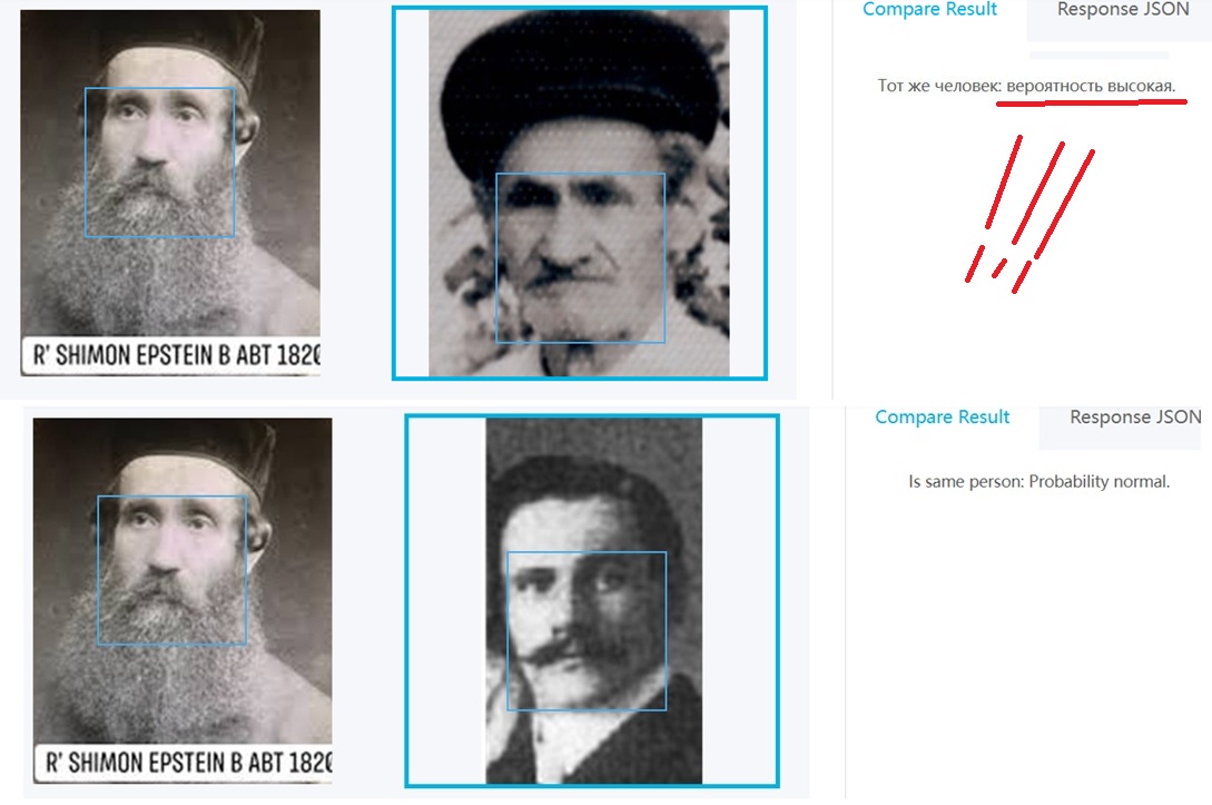Из-за потери оригинальности , совпадение очень хорошее идет только по 1 фото Израиля Эпштейна , а по второй его фото пишет , что нормальное совпадение (значит произошла какая то потеря данных при преобразовании) ..., но с фото Петра Шеломова совпадение хорошее .