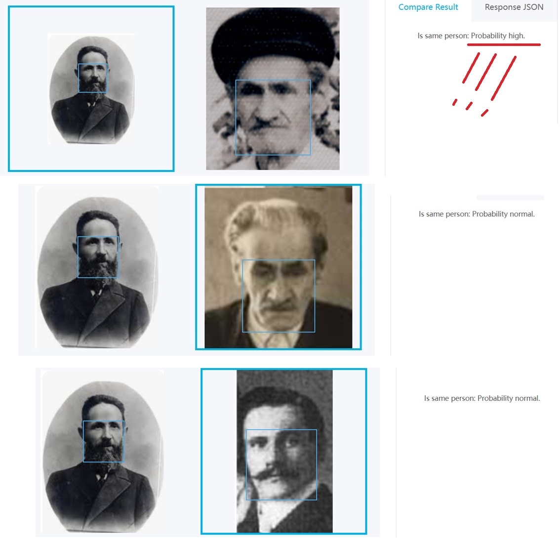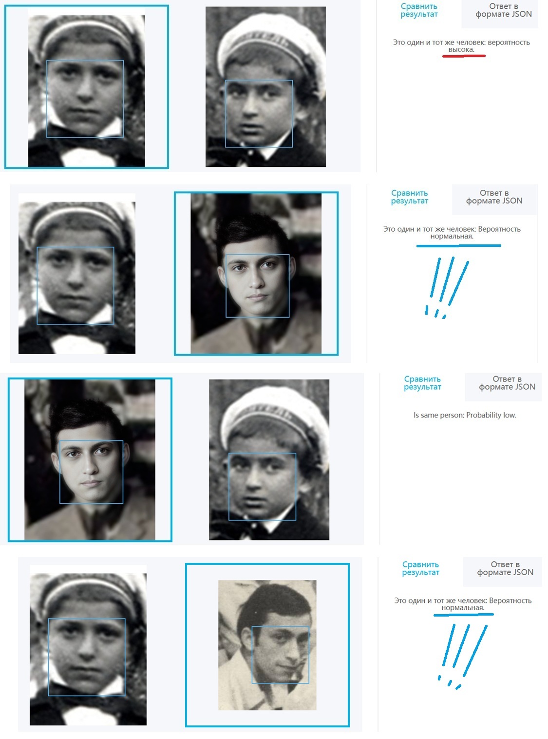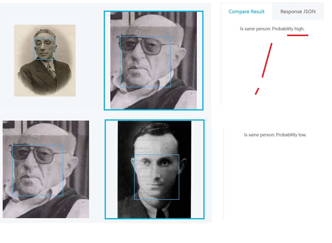 Из-за потери оригинальности , совпадение очень хорошее идет только по 1 фото Израиля Эпштейна , а по второй его фото пишет , что нормальное совпадение (значит произошла какая то потеря данных при преобразовании) ..., но с фото Петра Шеломова совпадение хорошее .