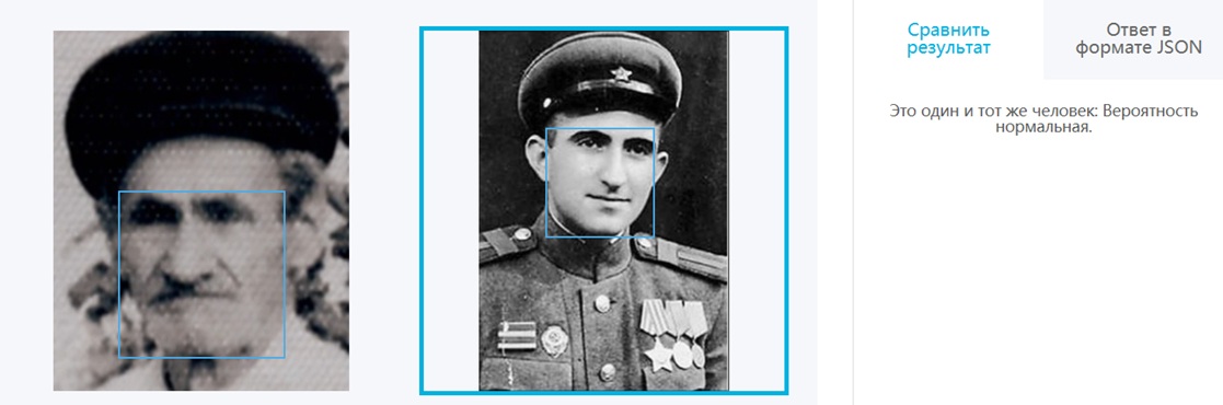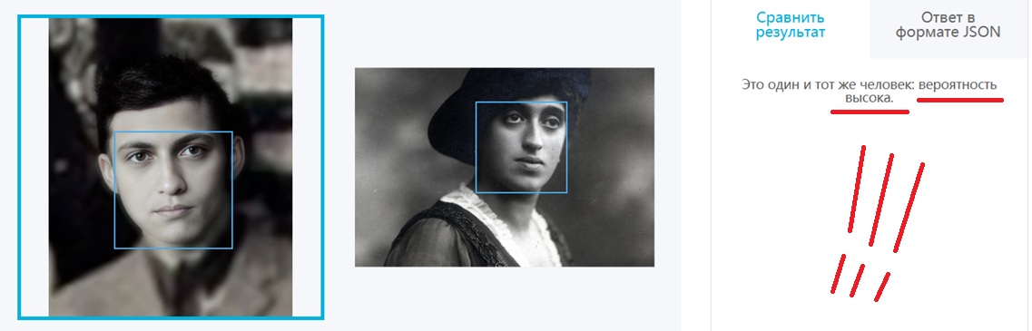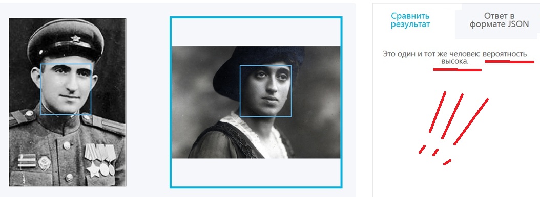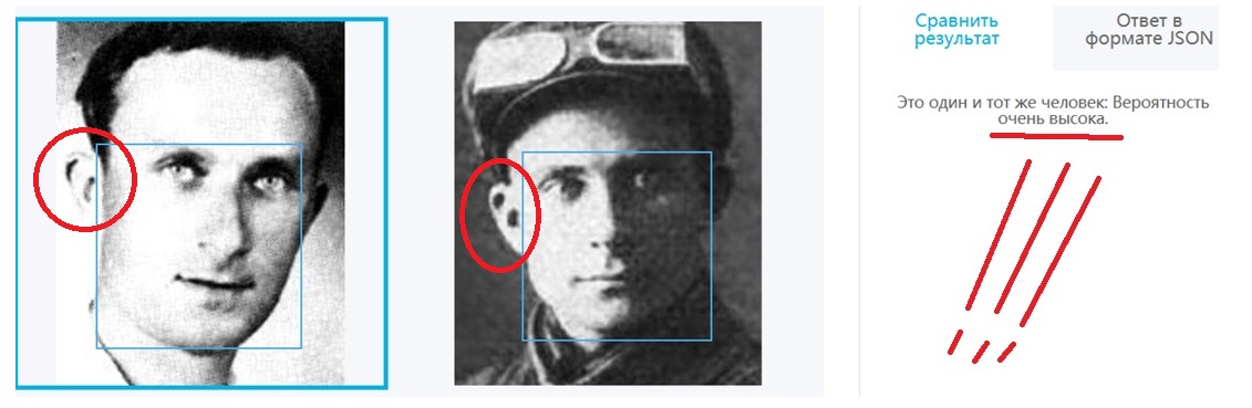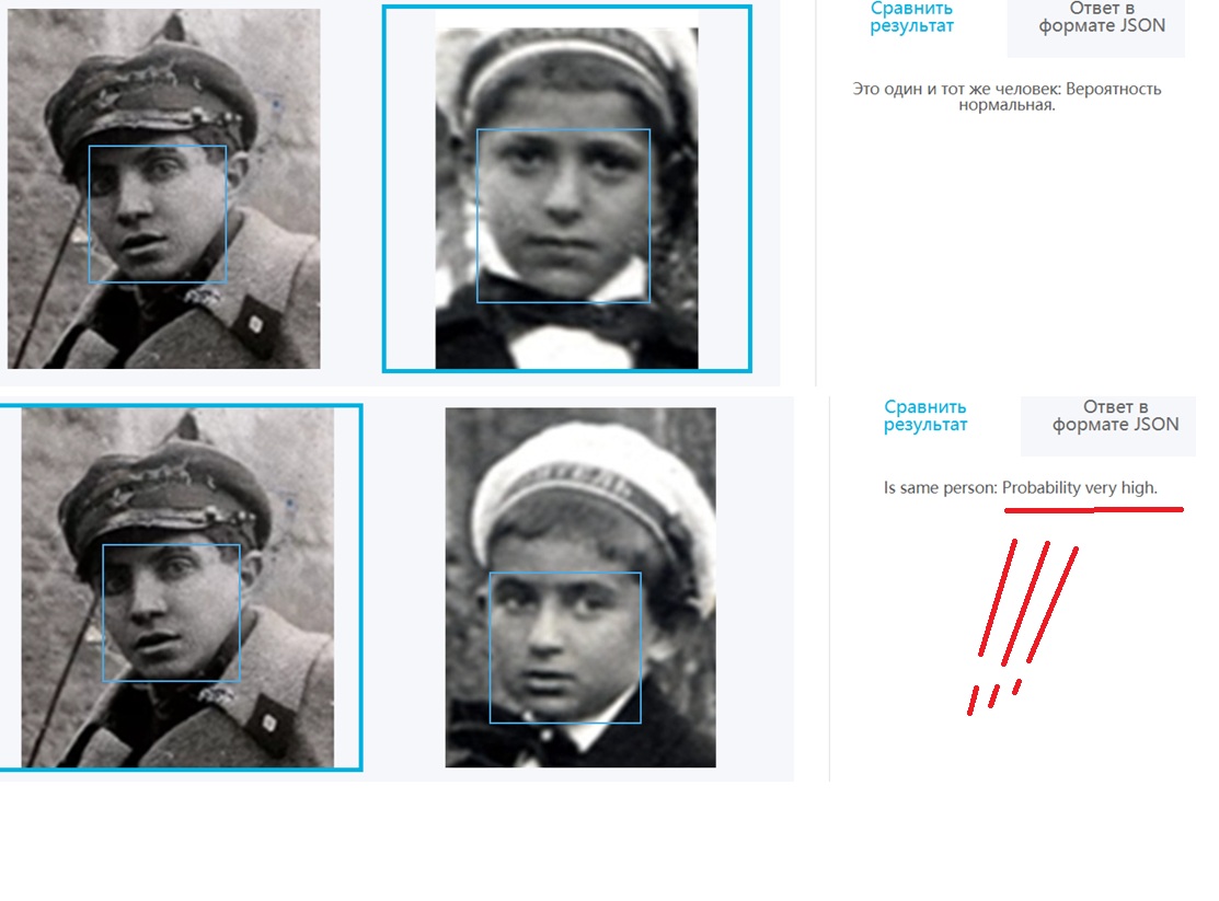 И сразу бинго ! Вероятность совпадения высокая ! что точно говорит о родственной связи. Даже нормальный совпадения говорит о родственной связи ... , только более отдаленной по генам .. Я добавила еще одну фотографию Ивана Ивановича Шеломова ... в другом ракурсе и опять бинго ! Опять вероятность совпадения высокая !!! Это точно говорит о том , что у брата Ивана отец или мать были из рода Эпштейнов ..